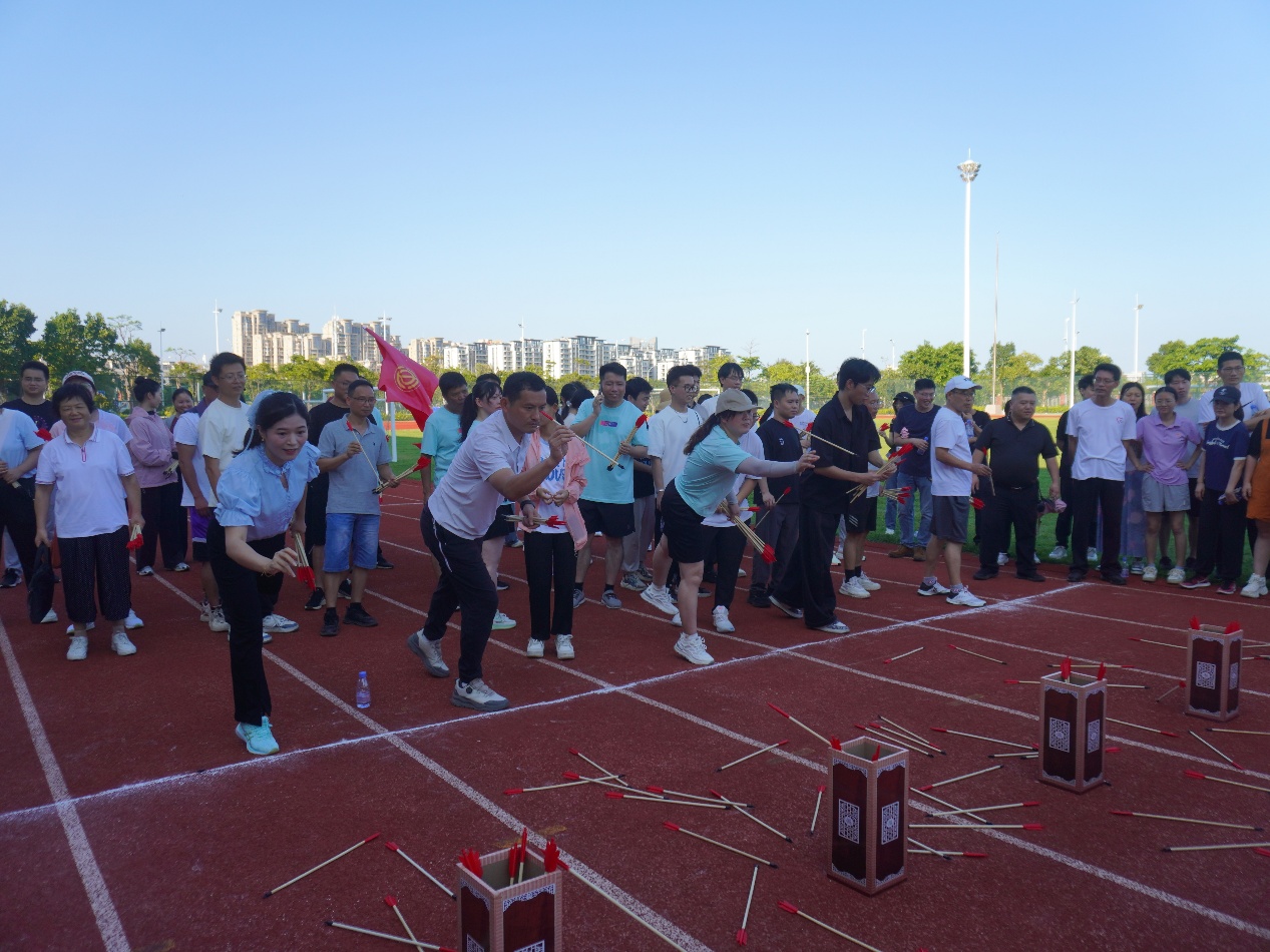 运动会设置投壶、同心鼓、踏板竞速、龙行天下四项团体趣味项目,将趣味性与协作性完美结合。投壶项目中,参赛选手凝神聚力,每一次精准投掷都展现着沉稳细致的工匠精神;同心鼓项目里,八人一组默契配合,鼓面颠球的节奏中,尽显团队信任与同步协作的力量;踏板竞速环节,四人同步迈步、口令一致,执行力在整齐步伐中凝聚,共识在统一节奏中达成;龙行天下项目中,八人共同提举“龙身”稳步前行,以目标一致、节奏统一的协作,展现出如蛟龙出海般的磅礴气势,赛场上欢呼声、喝彩声此起彼伏。