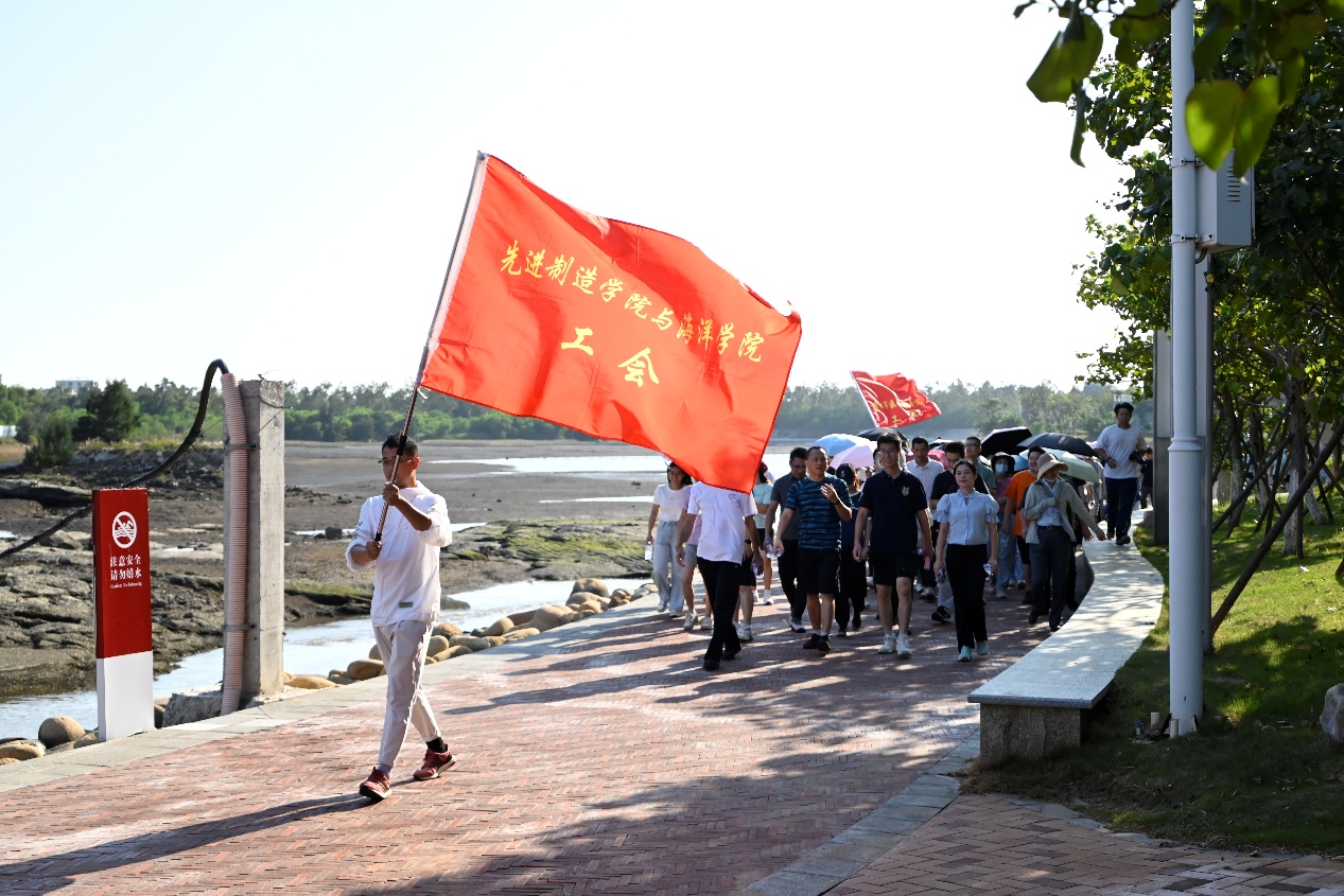 开幕式上,晋江校区管委会常务副主任、学院党委书记游生辉致辞。他表示,此次活动是跨越行业界限、汇聚各方情谊的运动嘉年华,希望全体参与者秉持“友谊第一,比赛第二”的宗旨,在运动中享受快乐,在协作中凝聚力量。随后,健步走环节正式启动,各单位代表队手持队旗,精神昂扬地从田径场出发,沿途经过师生服务中心、后勤服务中心、礼堂、图书馆、行政办公楼等校园地标,最终沿湖返回。整齐的队伍与坚定的步伐,生动诠释了校地企各方携手并进、共创未来的共同愿景。